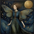 A mystical figure with delicate butterfly wings stands against a starry night sky, adorned with golden accents. She wears a flowing gown and gently interacts with fluttering butterflies.