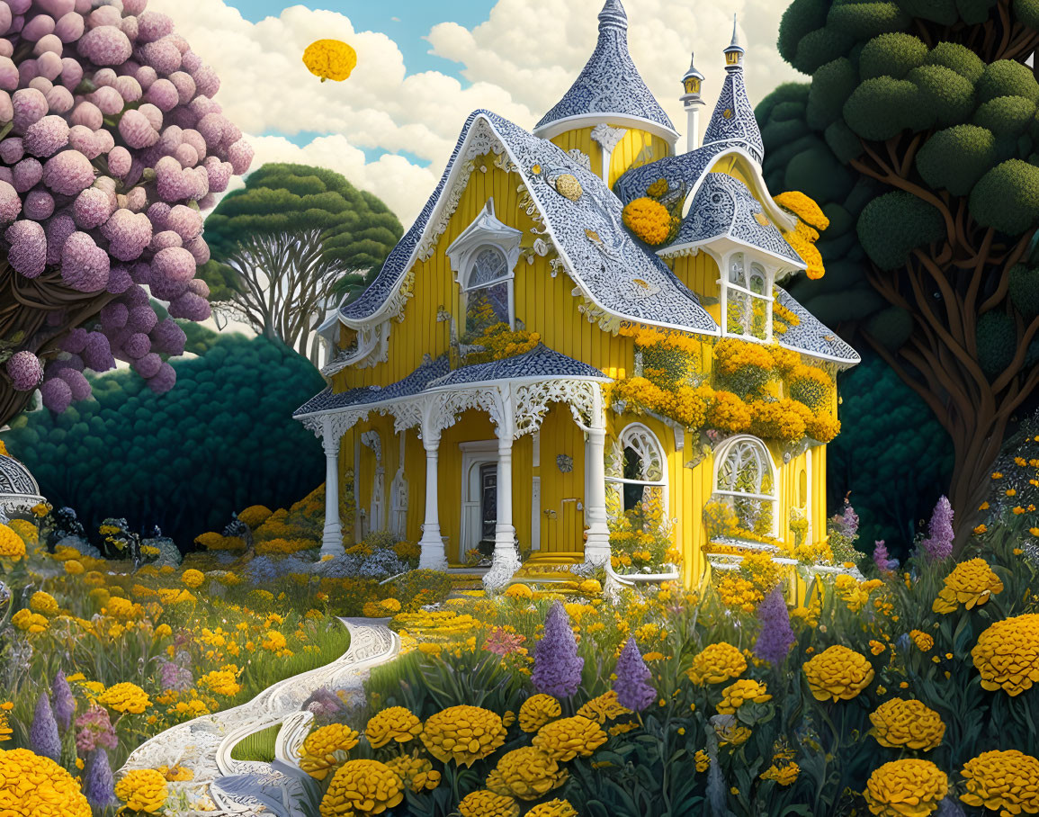 Yellow Cottage Surrounded by Purple and Yellow Flowers