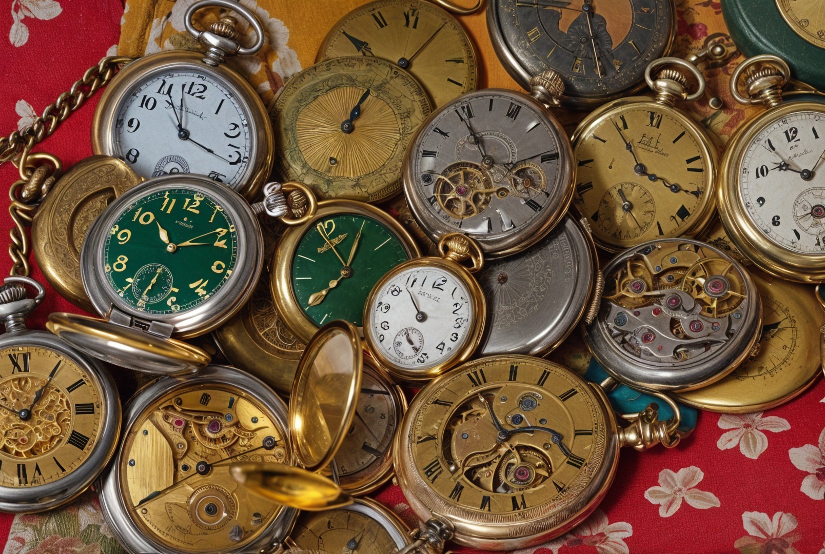 A vibrant collection of vintage pocket watches sprawled on a patterned fabric, showcasing intricate gears and diverse face designs in gold and silver tones. Timeless elegance and craftsmanship.