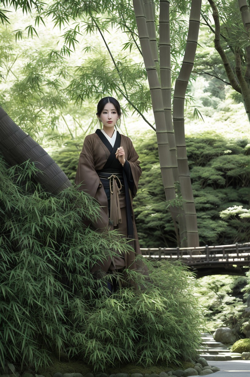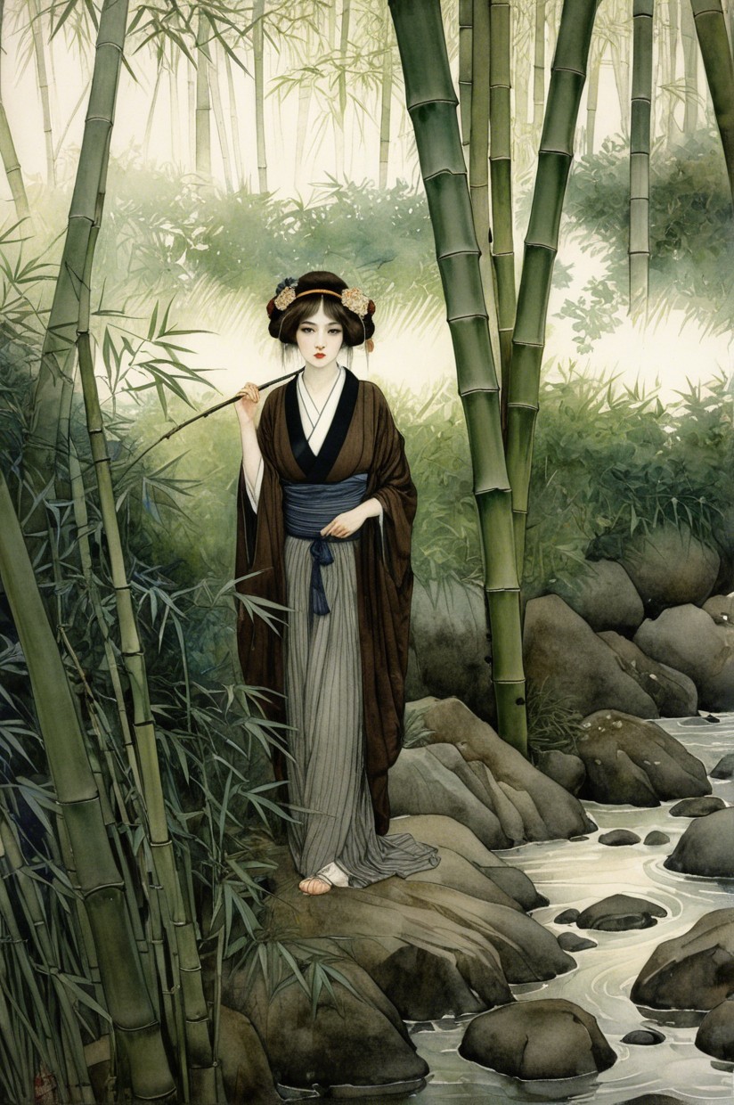 A traditional Asian lady stands among bamboo, clutching a book, exuding a serene, contemplative aura.