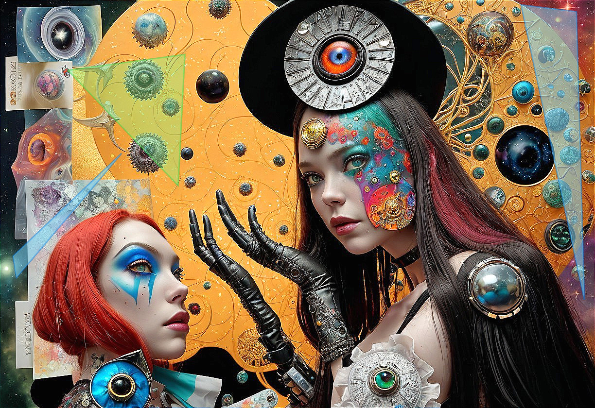Two women with cosmic-themed makeup and adornments against an intricate, celestial background.