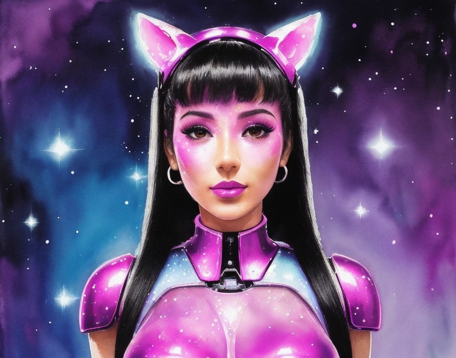 Prompt: "a beautiful & exotic drawing of a sexy 23 year old Latino teletubbie Cyborg robot Woman, inspired by Sigmar Polke, flickr, action painting, purple and pink and blue neons, bokeh!! watercolor, alcohol inks on parchment"