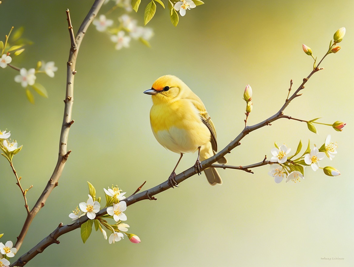 A vibrant yellow bird perches gracefully on a blooming branch, surrounded by delicate pink flowers. The warm, soft background enhances the serene and cheerful scene.