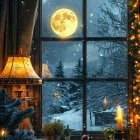 A cozy winter scene inside a room decorated for the holidays. A large window frames a snowy landscape with pine trees and a full moon, while a softly lit lamp and plants add warmth indoors.
