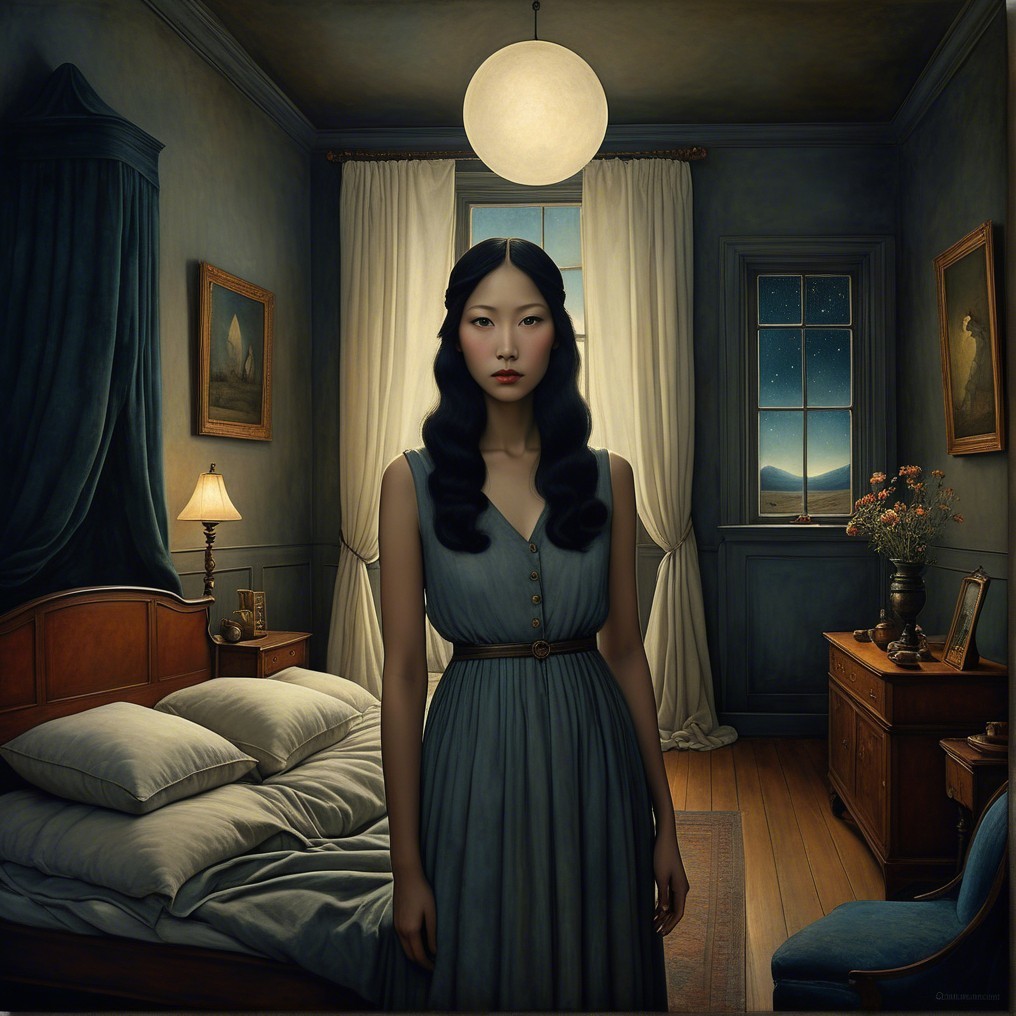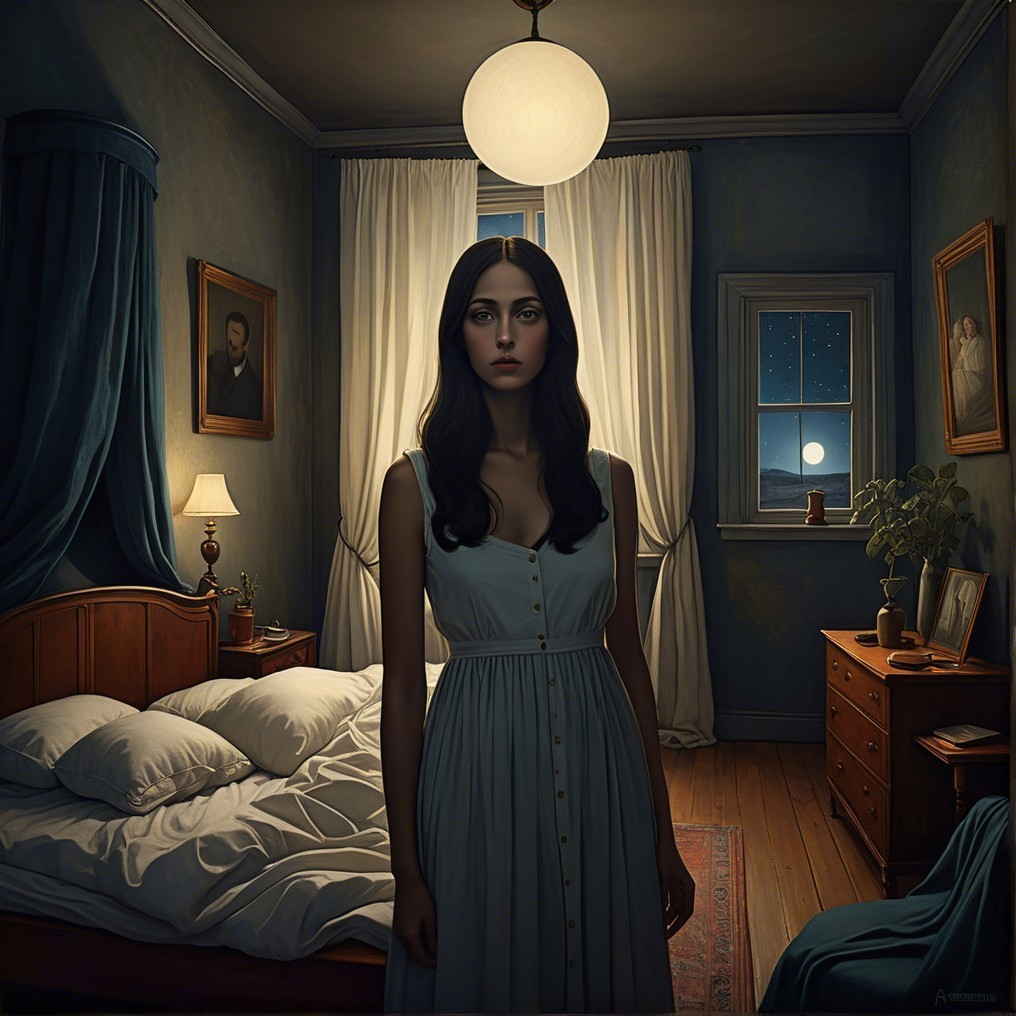 A young woman stands in a softly lit room adorned with paintings and elegant furnishings. She wears a flowing gray dress, her wavy hair cascading down, exuding a serene, contemplative presence.