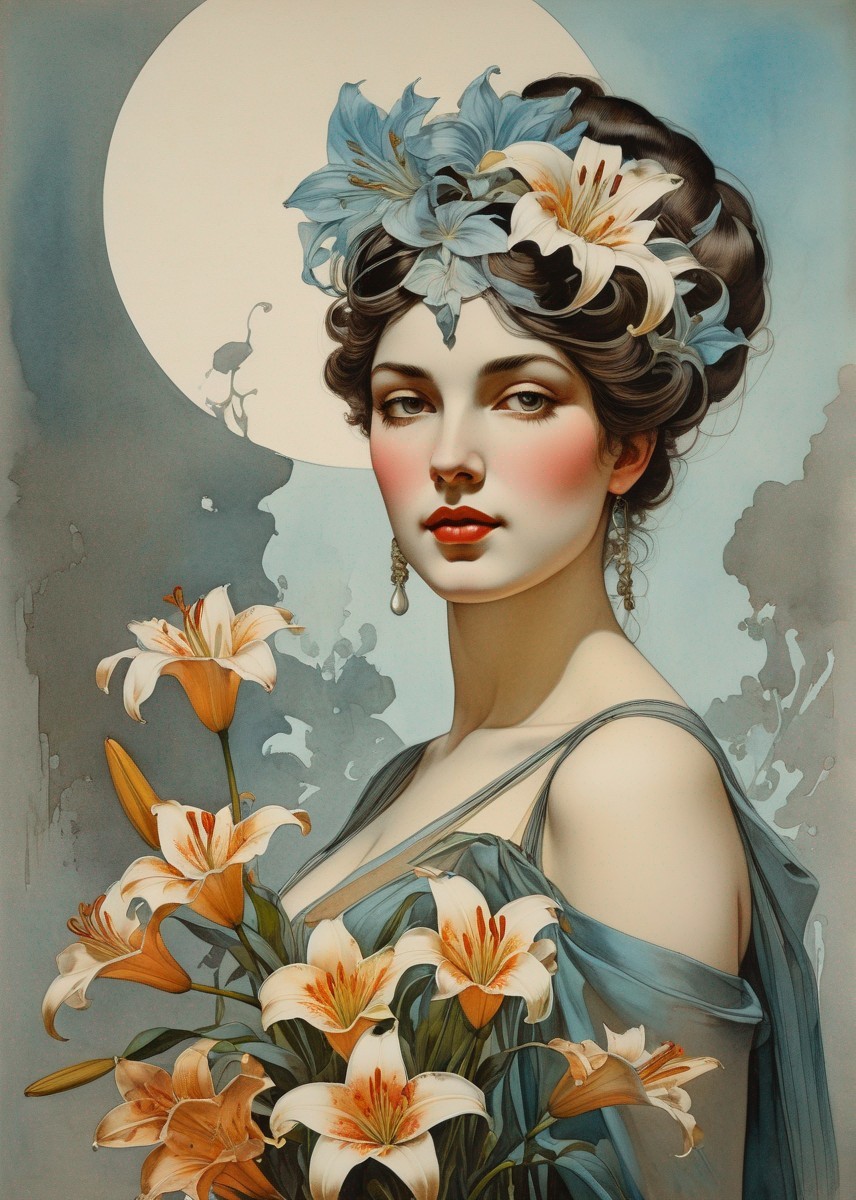 Fantasy portrait: Woman with floral headdress in front of stained-glass window