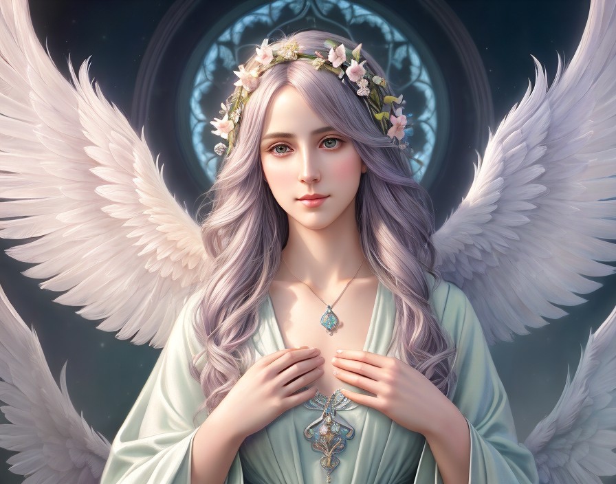 An ethereal figure with angelic wings and a floral crown emits a serene grace amidst a backdrop of stained glass windows.