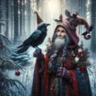 A wise old figure in a red and gold robe stands in a snowy forest, holding a black raven. Fur trim and Christmas ornaments in the trees create a magical winter atmosphere.