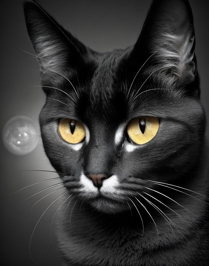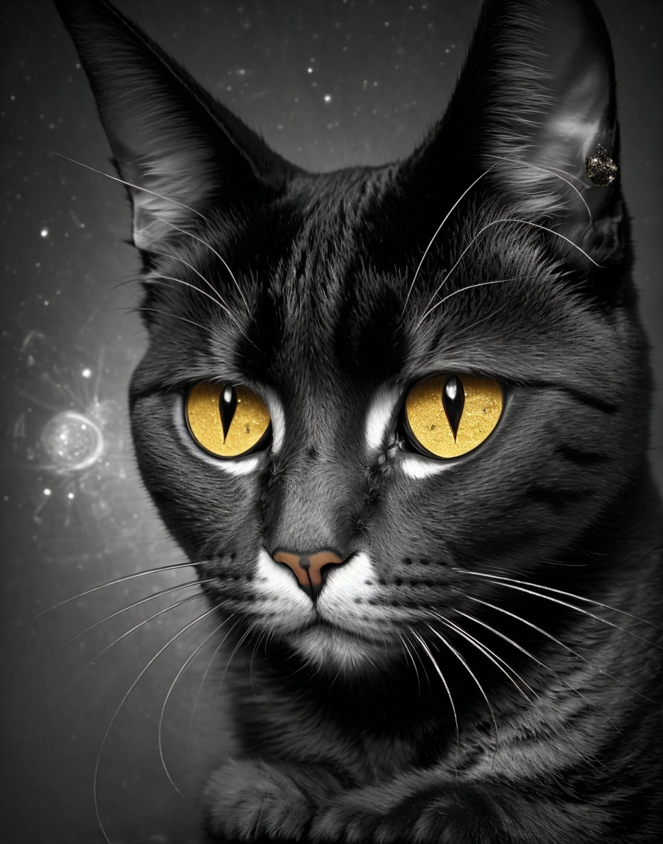 A close-up of a gray striped cat with vivid yellow eyes and a piercing gaze against a dark background.