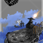 A futuristic, technologically advanced spacecraft hovers above the ocean's surface, featuring sleek designs and intricate details. In the background, additional ships and platforms are visible.