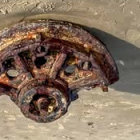 Large Rusted Industrial Wheel Surrounded by Concrete