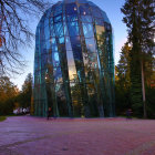 A futuristic glass dome stands serenely at twilight, surrounded by bare trees. The pathway glows softly, reflecting the tranquil water and the serene evening sky.