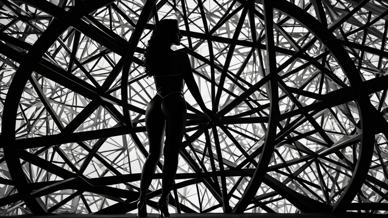 (Try from Eve) - A silhouetted figure stands against a backdrop of intricate geometric patterns. The interplay of light and shadow creates a striking contrast, emphasizing the curves and elegance of the form.
