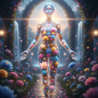A beautifully painted figure stands against a textured wall, surrounded by vibrant flowers and soft lighting. The artwork blends nature and the human form, creating a serene, artistic atmosphere.