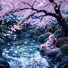 A serene scene features a woman in a floral kimono sitting by a tranquil pond, surrounded by cherry blossoms. Colorful koi swim beneath rippling water, creating a peaceful atmosphere.