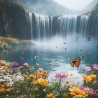 A stunning landscape featuring a majestic waterfall cascading into a serene lake. Vibrant flowers bloom along the shore, surrounded by lush greenery and soft clouds in a bright blue sky.