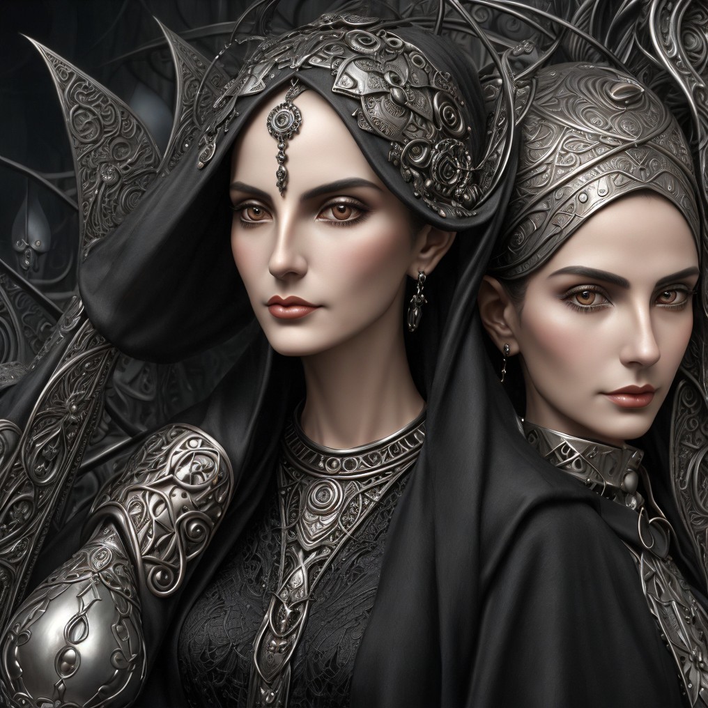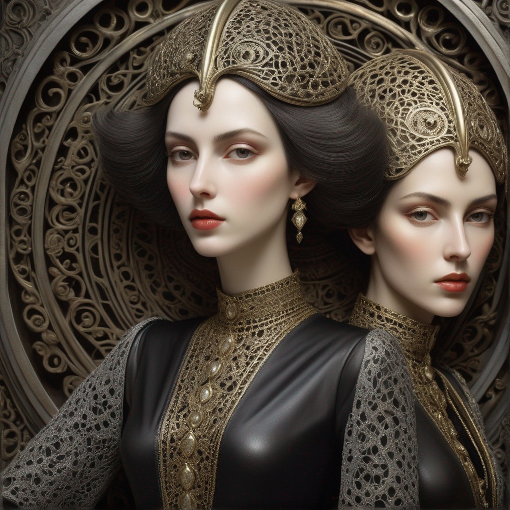 A portrait of a woman with elaborate, golden headgear and detailed attire, exuding regal and fantastical elegance.