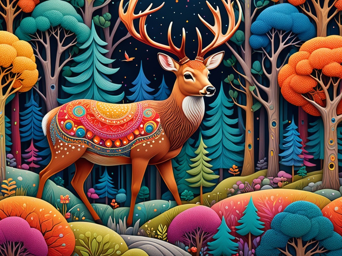 A stylized deer stands in a fantasy forest, adorned with colourful patterns.