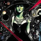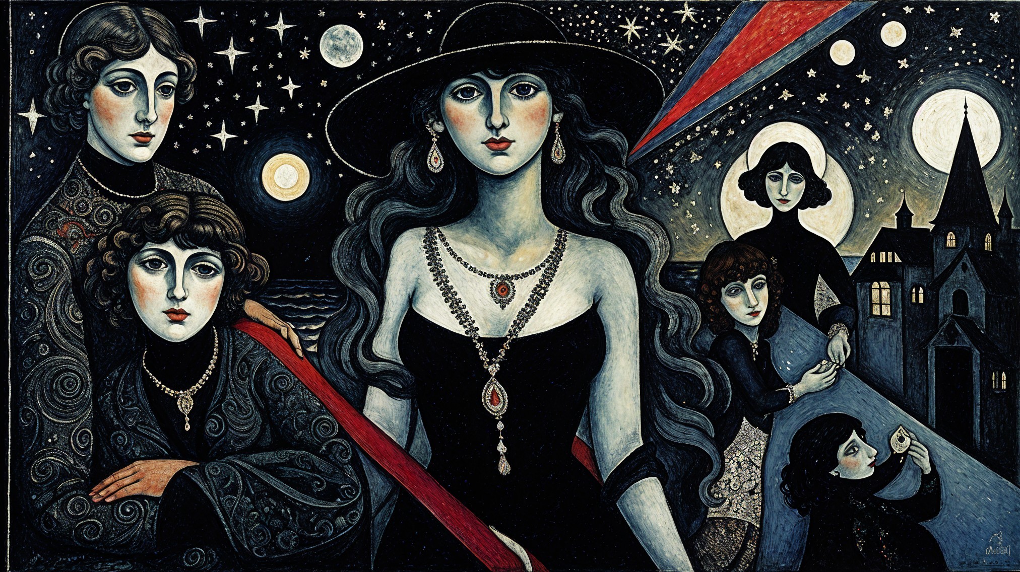 A dark fantasy-style painting depicts a group of women in the style of Gustav Klimt, with the central figure being a fair-skinned woman with dark hair wearing a large, wide-brimmed black hat, a low-cut black dress, and elaborate necklaces and earrings. She is surrounded