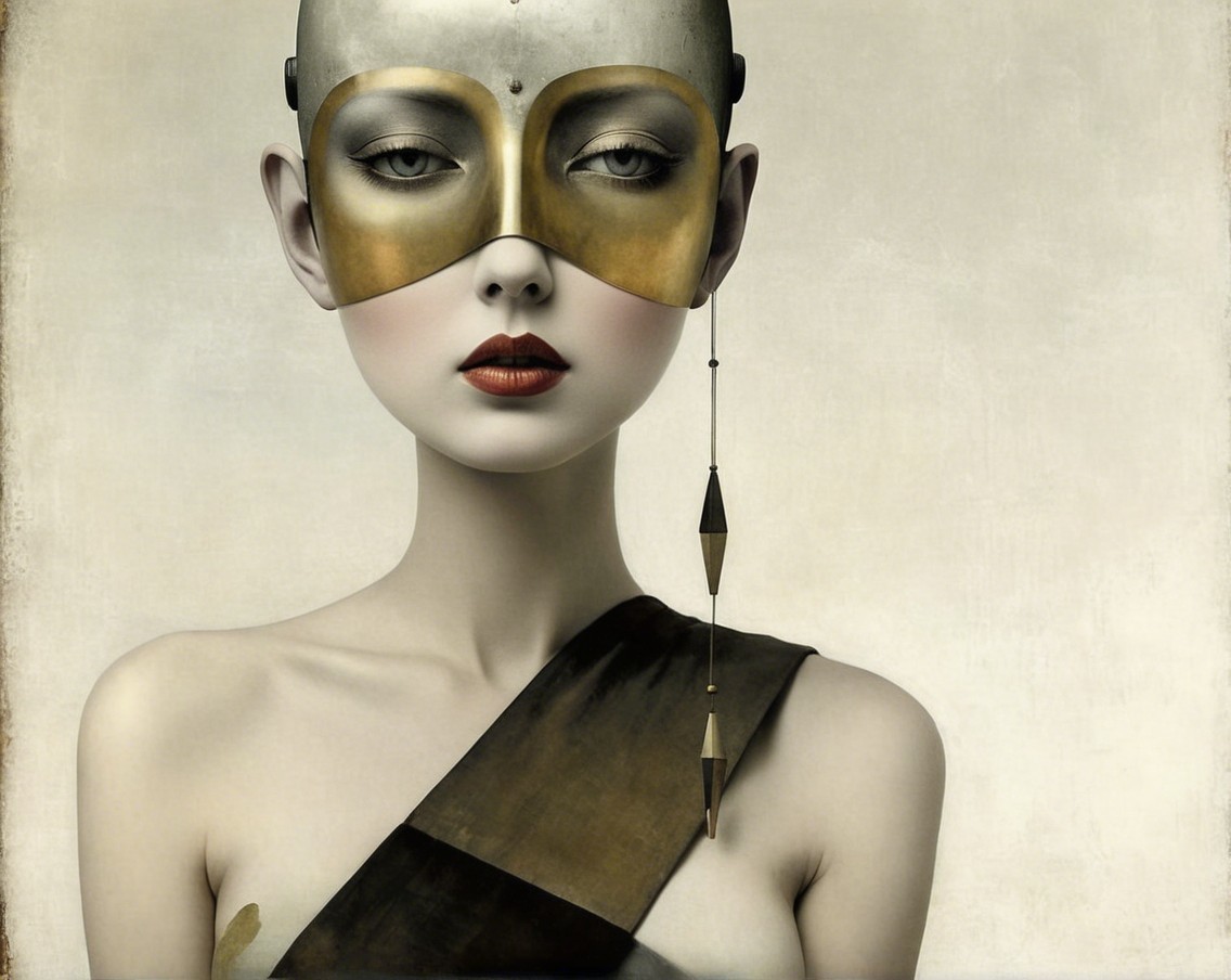 A striking portrait features a woman with a metallic mask, bold makeup, and an elegant pose. The contrasting tones highlight her mysterious aura and artistic expression. Original Prompt: