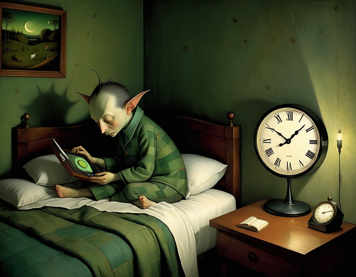 A whimsical character with pointy ears sits on a bed, engrossed in a device. The room features a large clock, soft lighting, and a cozy atmosphere, creating a surreal, dreamlike scenario.