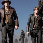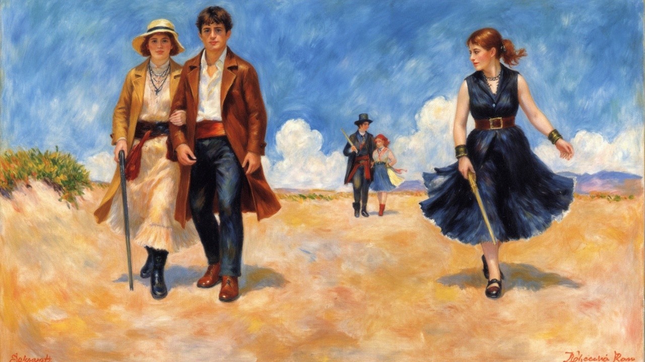 A vibrant, impressionistic scene depicts two pairs walking on a sunlit path: a young couple dressed in vintage styles, and another pair in the distance, exploring the open landscape.