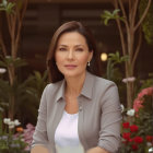 A young woman stands confidently in a chic outfit, featuring a light blazer and a delicate necklace. Her stylish look is complemented by soft makeup and a neutral background.