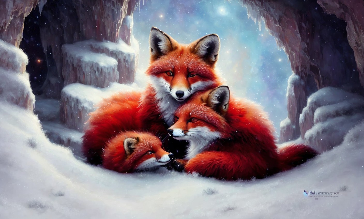 Prompt: highly detailed painting of cute furry red foxes bears cuddled up inside snowy fantasy heart-shaped cavern by william turner, by greg rutkowski, by william constable, thick brush strokes and visible paint layers, trending on artstation. stunning cosmic foreground. splashes of cosmic colors.