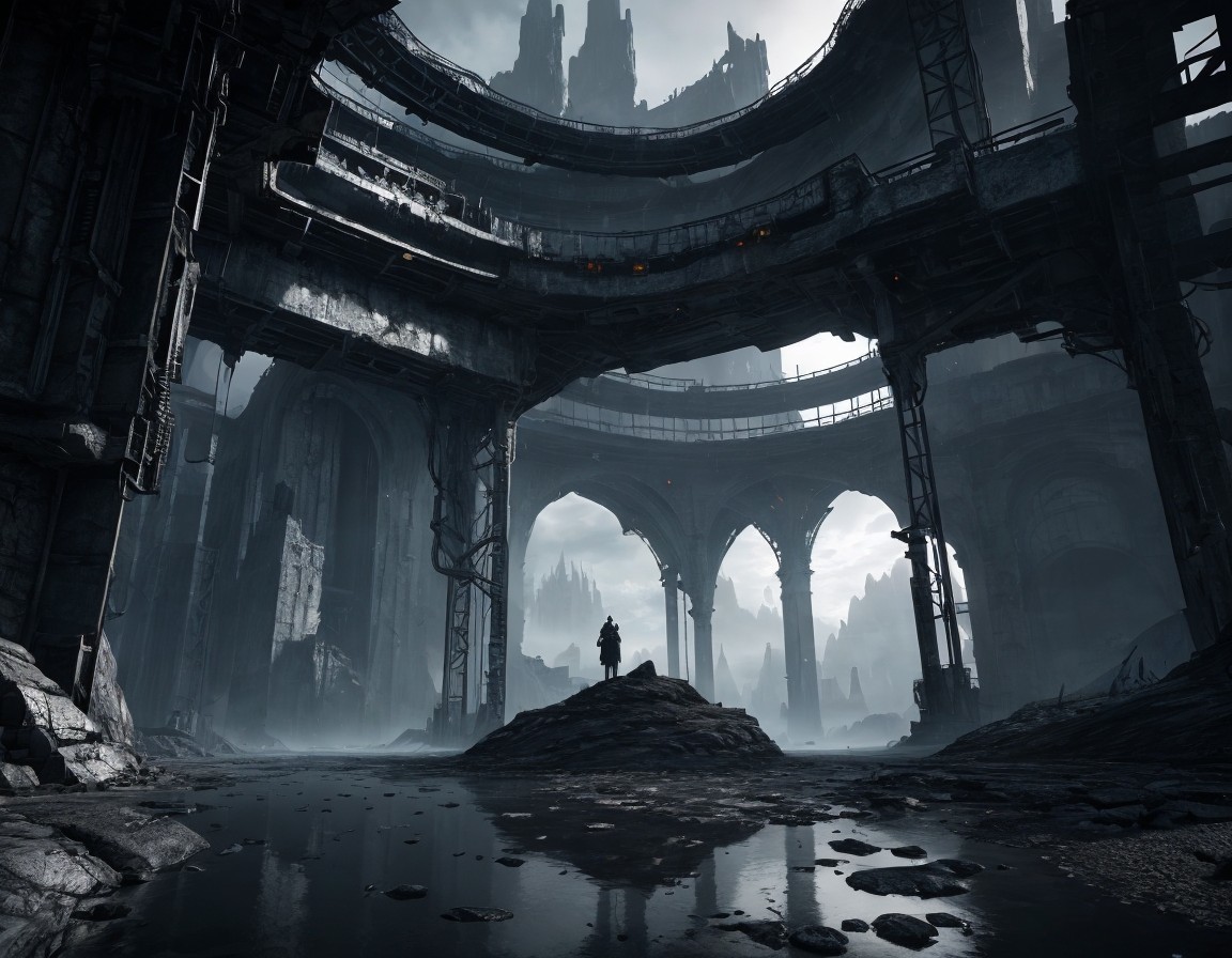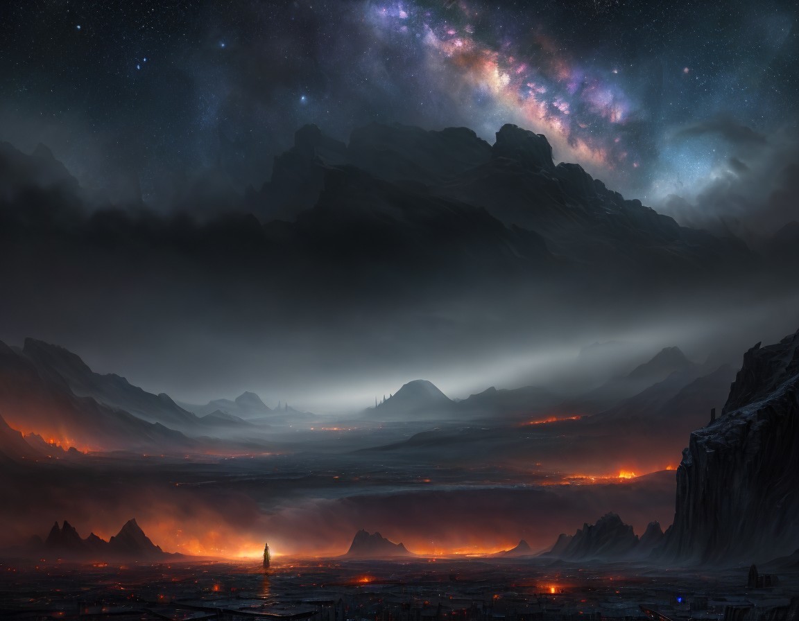A dark, fantastical landscape features a silhouette standing before a glowing lava river, framed by towering, ominous structures under a starry, cosmic sky and billowing clouds.