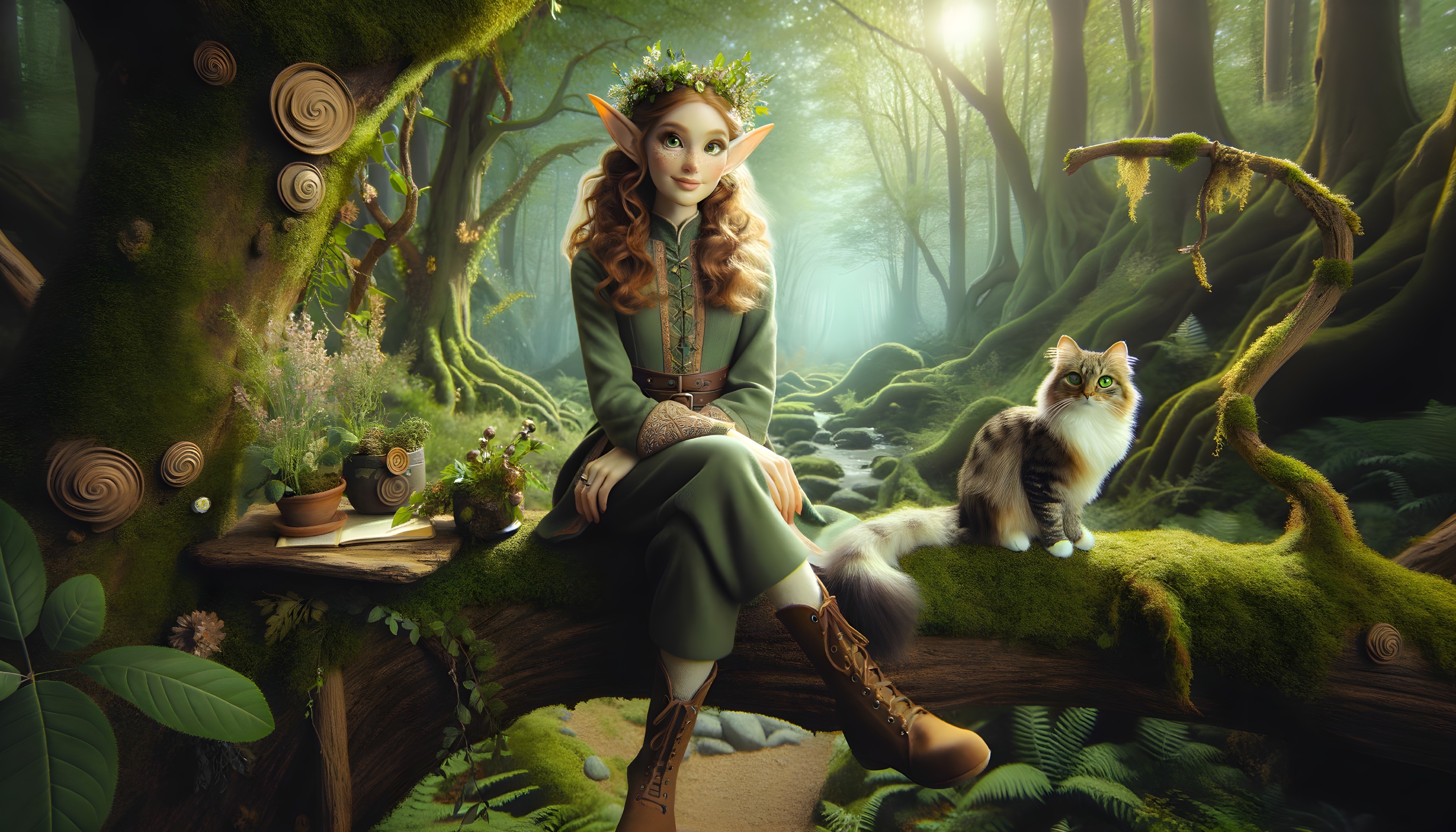 A fantasy image of an elf sitting on a mossy tree with a cat in an enchanted forest.