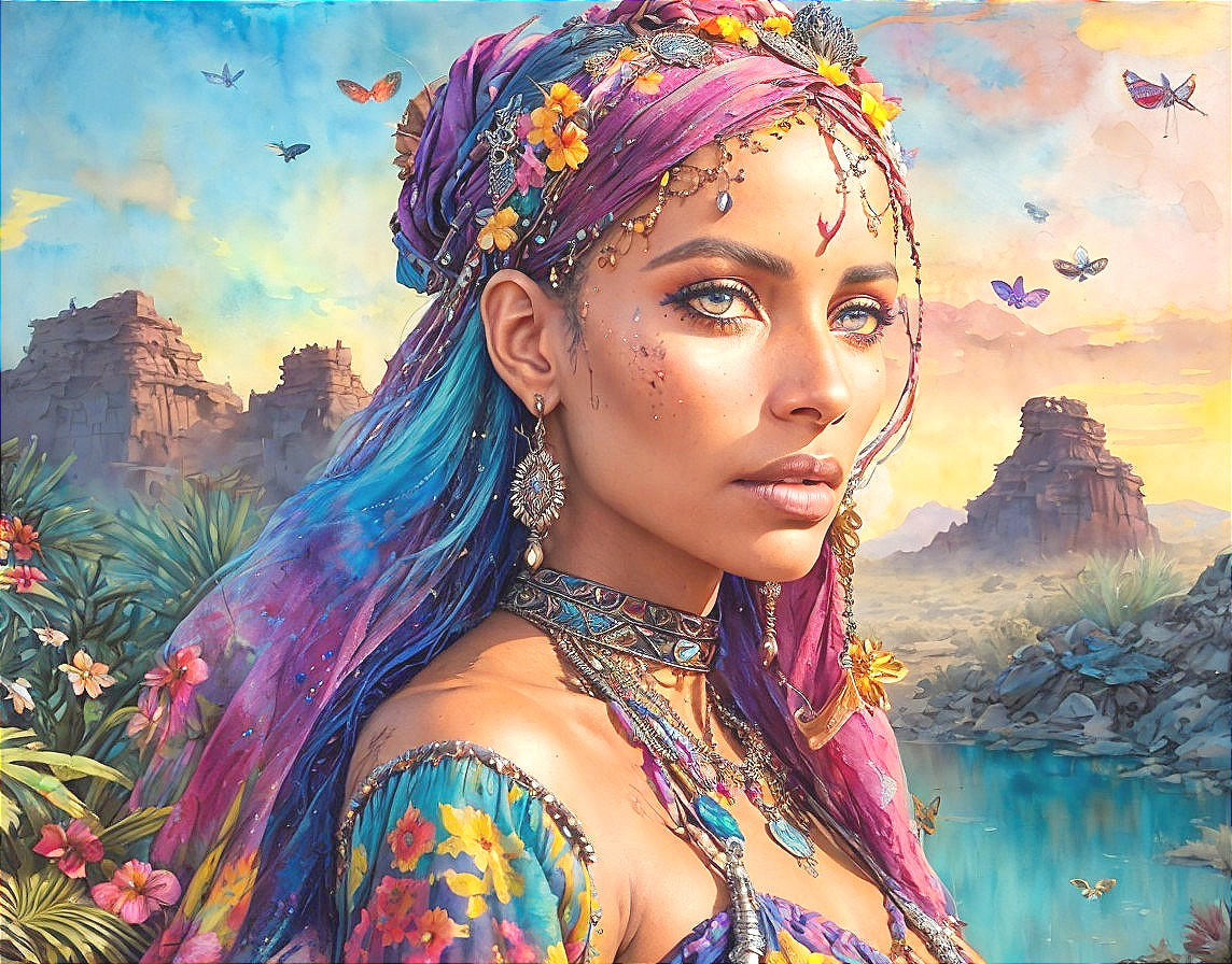 A vibrant artwork of a woman with colorful hair, adorned with flowers and jewelry, surrounded by a serene landscape and butterflies.