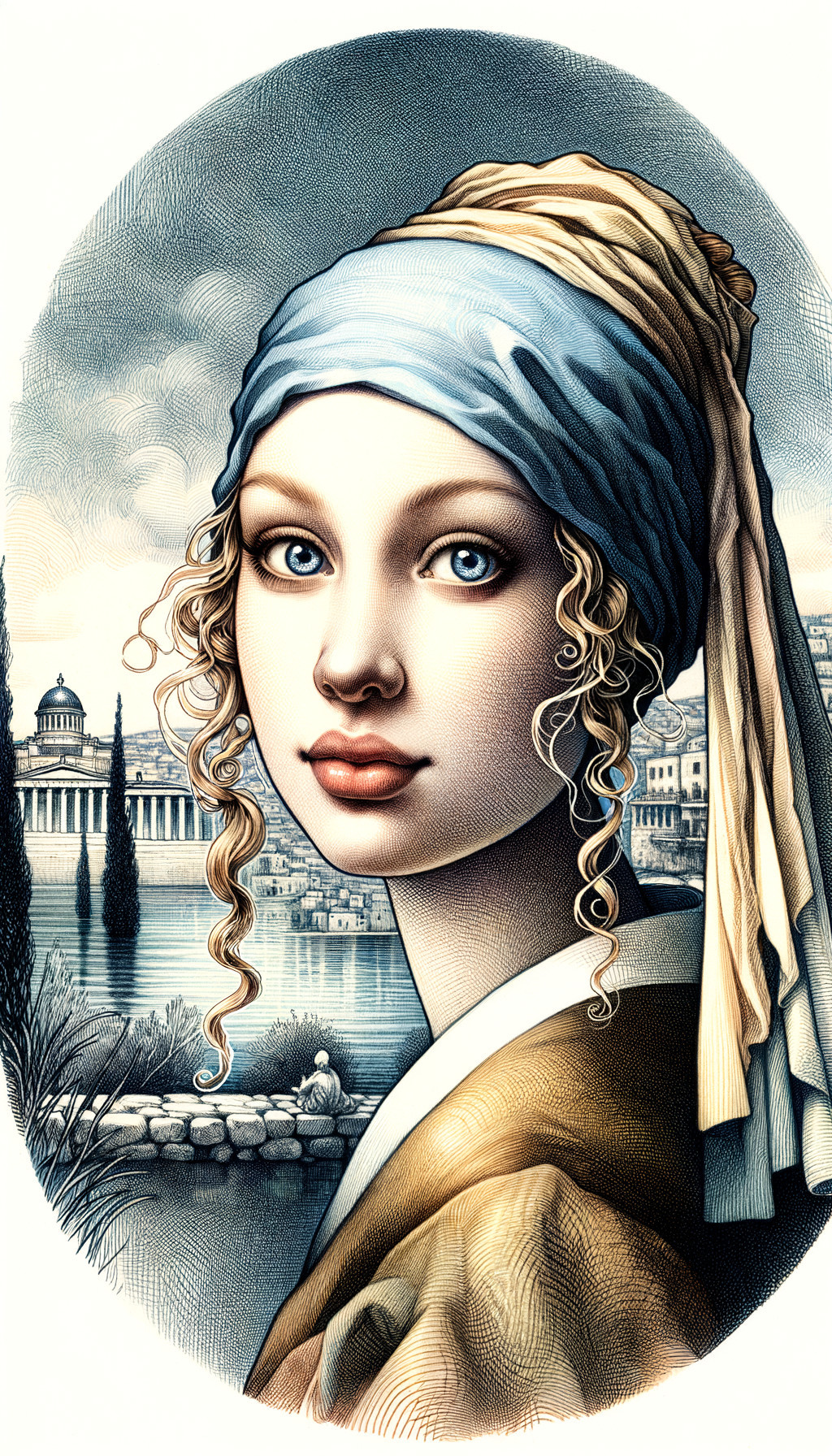 An illustrated portrait of a woman with a blue headscarf and golden robe, with an ancient cityscape and sea in the background.