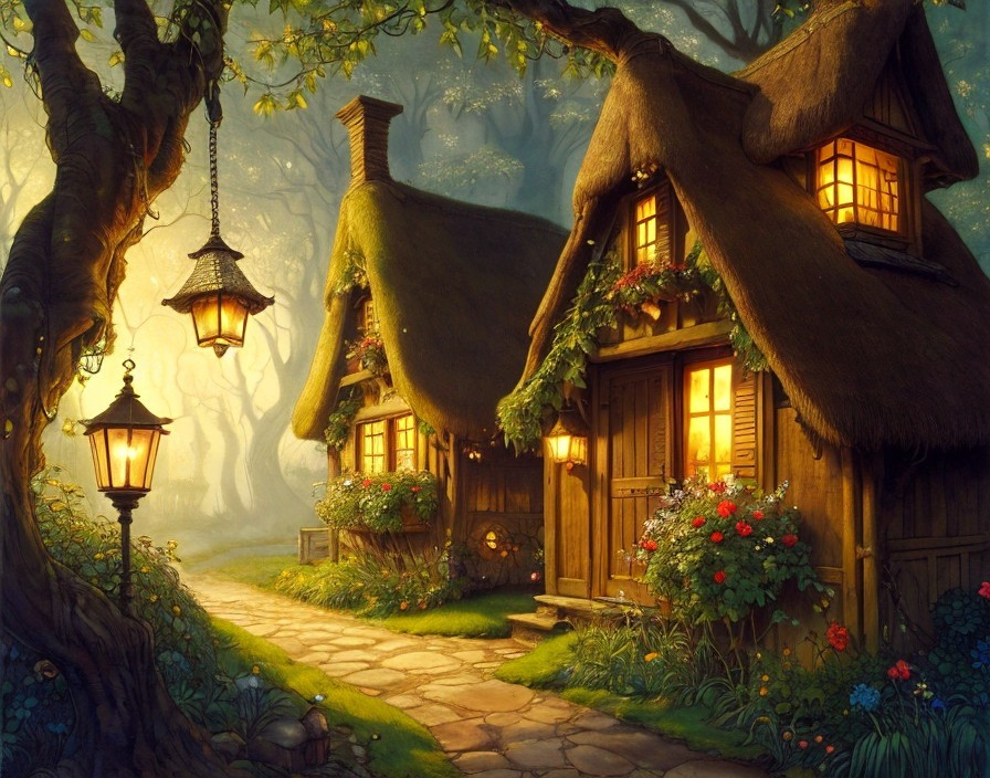 Prompt: "Hidden within the foliage are quaint cottages, their thatched roofs adorned with twisted vines and adorned with glowing lanterns that cast a warm, golden glow. These cottages belong to the mischievous fairies who flit about, their delicate wings shimmering like opalescent gossamer by Arthur Rackham, highly detailed, fantasy, whimisical, art style inspired by Arthur Rackham, soft strokes, soft colors."