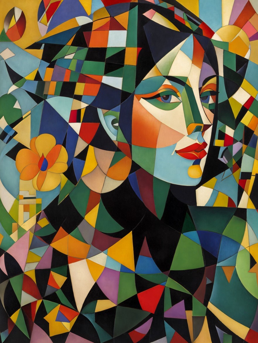 Cubist style portrait with abstract geometric shapes in a rich color palette, featuring a prominent female figure.
