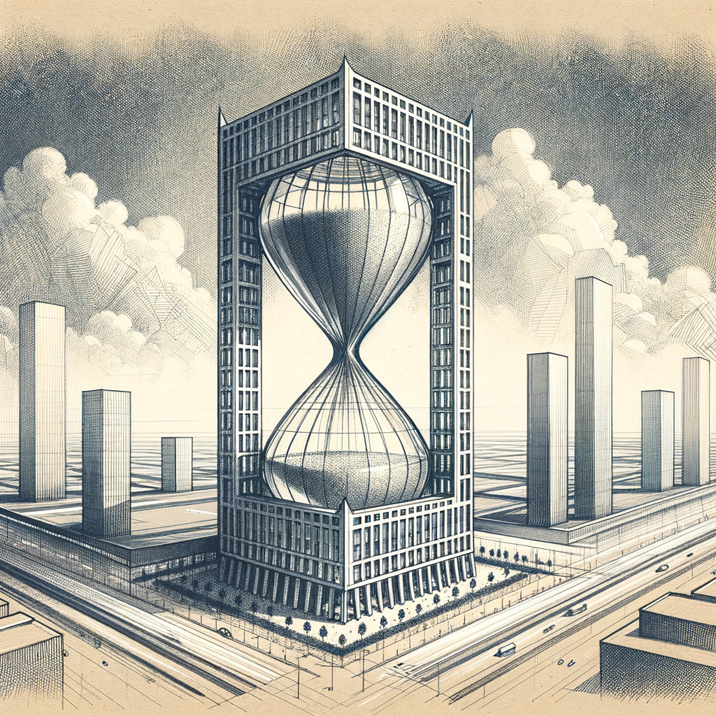 Prompt: "The architectural design of the building features an hourglass-shaped building as main, central volume whose upper and lower bulb are regular equilateral pyramids with a rectangular base; upper pyramid is flipped upside down; for structural stability, four vertical pylons, massive enough to take up some of the load, are required. The building is made of glass and steel structures and contains approximately 25 floors. It is integrated into the context of the modern city at the junction of development and parkland. Spirit markers and ink pen. Architectural sketching manner. Hatching and cross hatching."