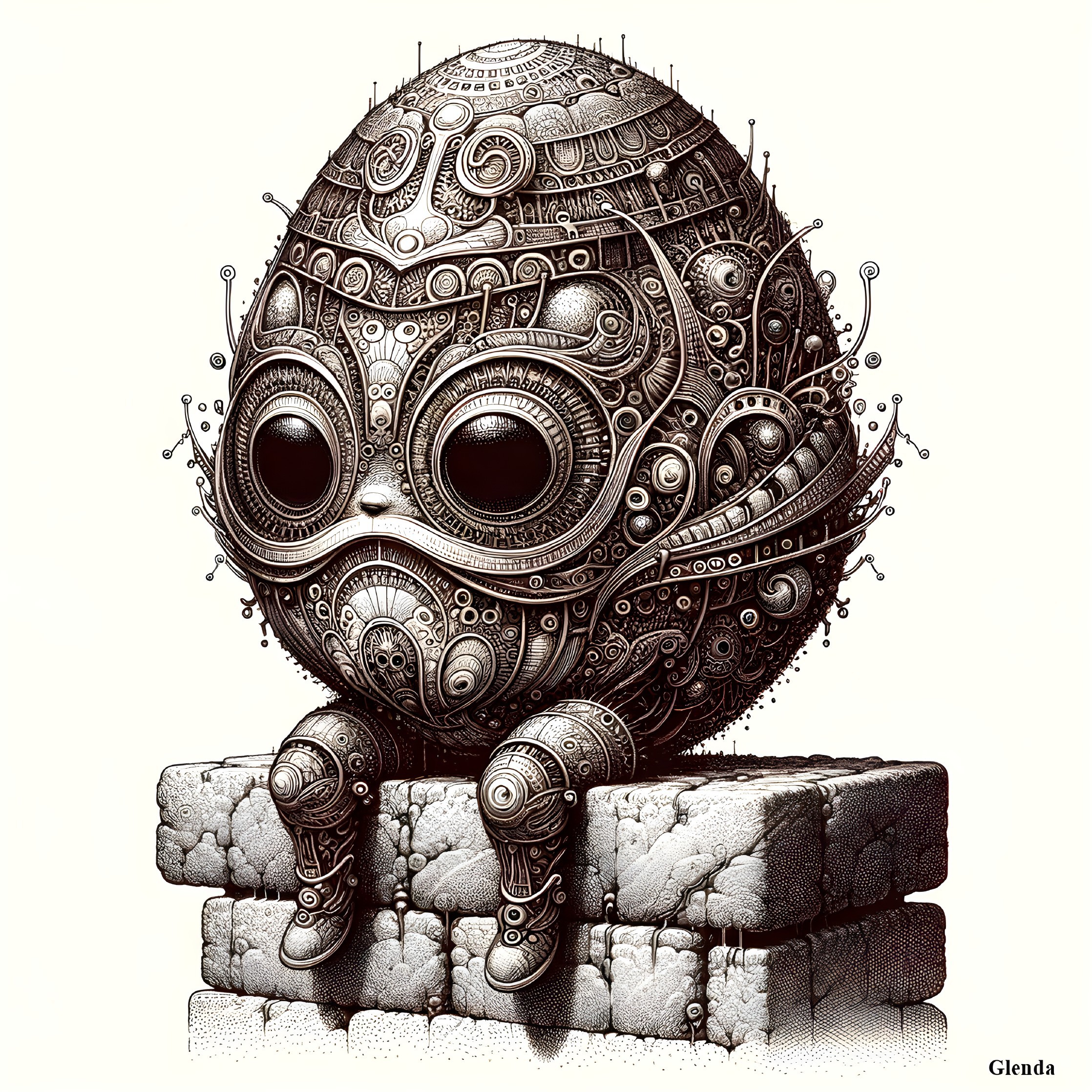 An intricate, detailed drawing of a spherical creature resembling Humpty Dumpty with big eyes and ornate patterns. The creature is sitting on stone blocks.