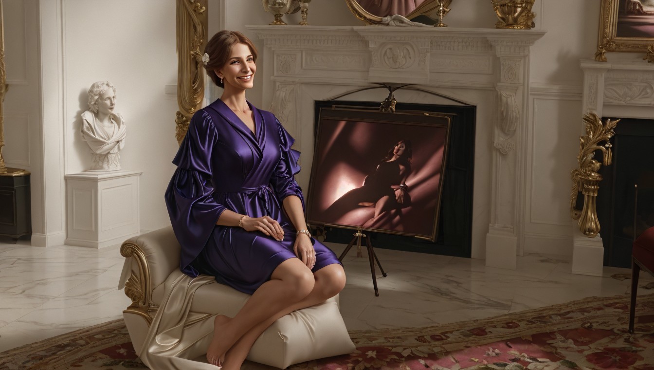 Woman in Purple Dress Sitting by Fireplace with Birds