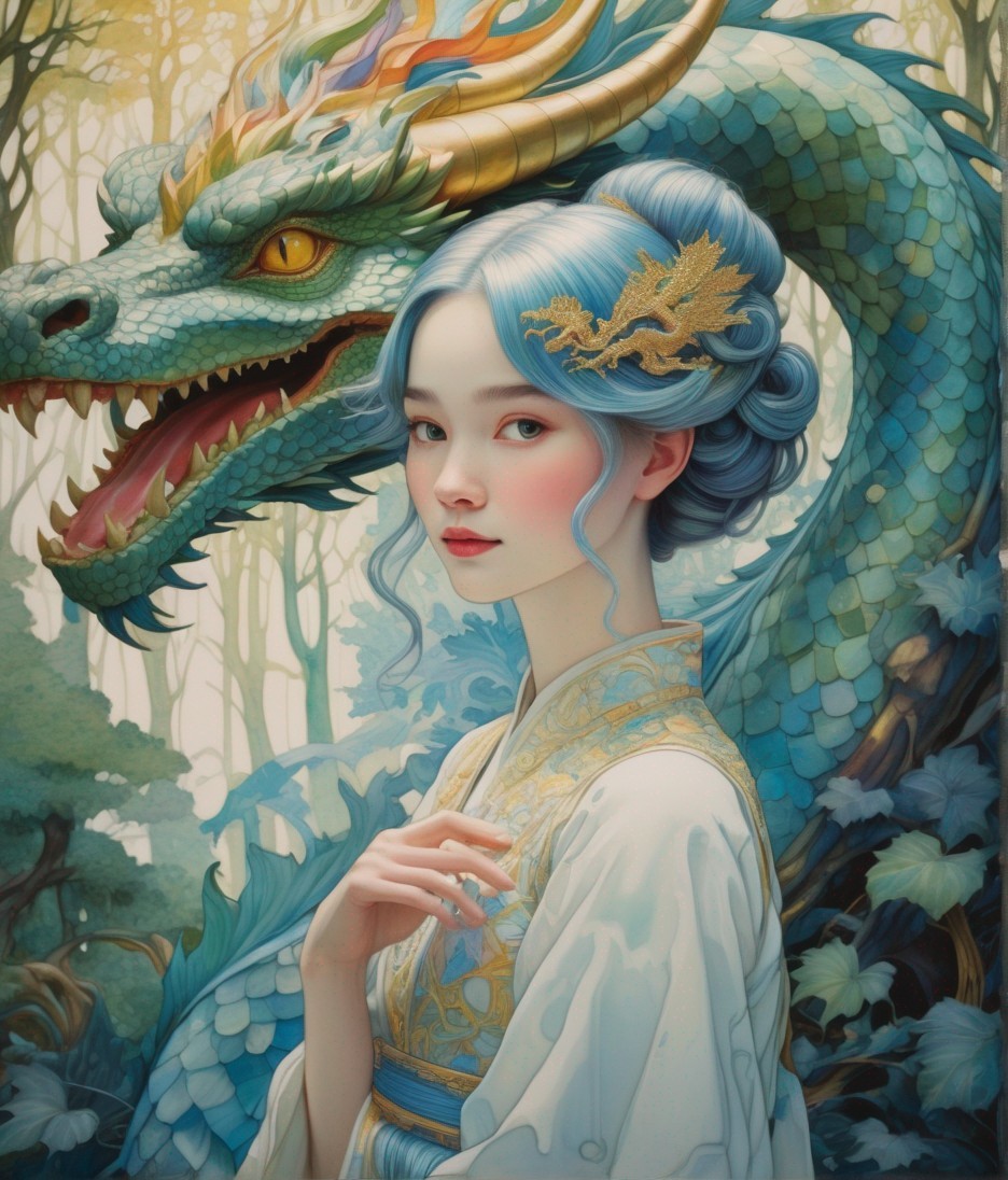 Prompt: the beautiful cheshire princess has found joy, she is protected by the mythical rainbow dragon. Whimsical Forest background. Android Jones, James Jean, takato yamamoto, Arthur Rackham. watercolor, volumetric lighting, maximalist, concept art, intricately detailed, elegant, expansive, 32k, fantastical, golden ratio principles, haunted, glass sculpture, honeycomb patterns, art by makoto shinkai, conrad roset. 3d, iridescent watercolors ink, polished finish, gradient chrome colors.