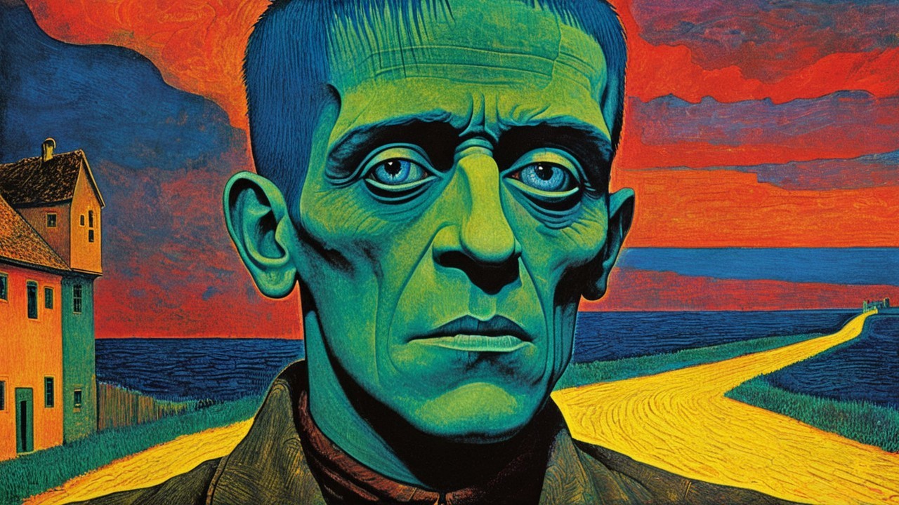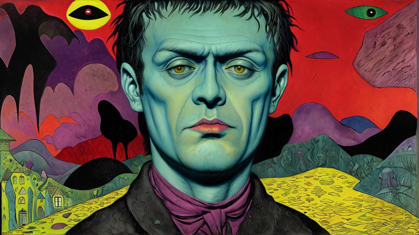 The image features a stylized, surreal portrait of a blue-skinned figure with red eyes, set against a vibrant, abstract landscape with hills and colorful celestial bodies.
