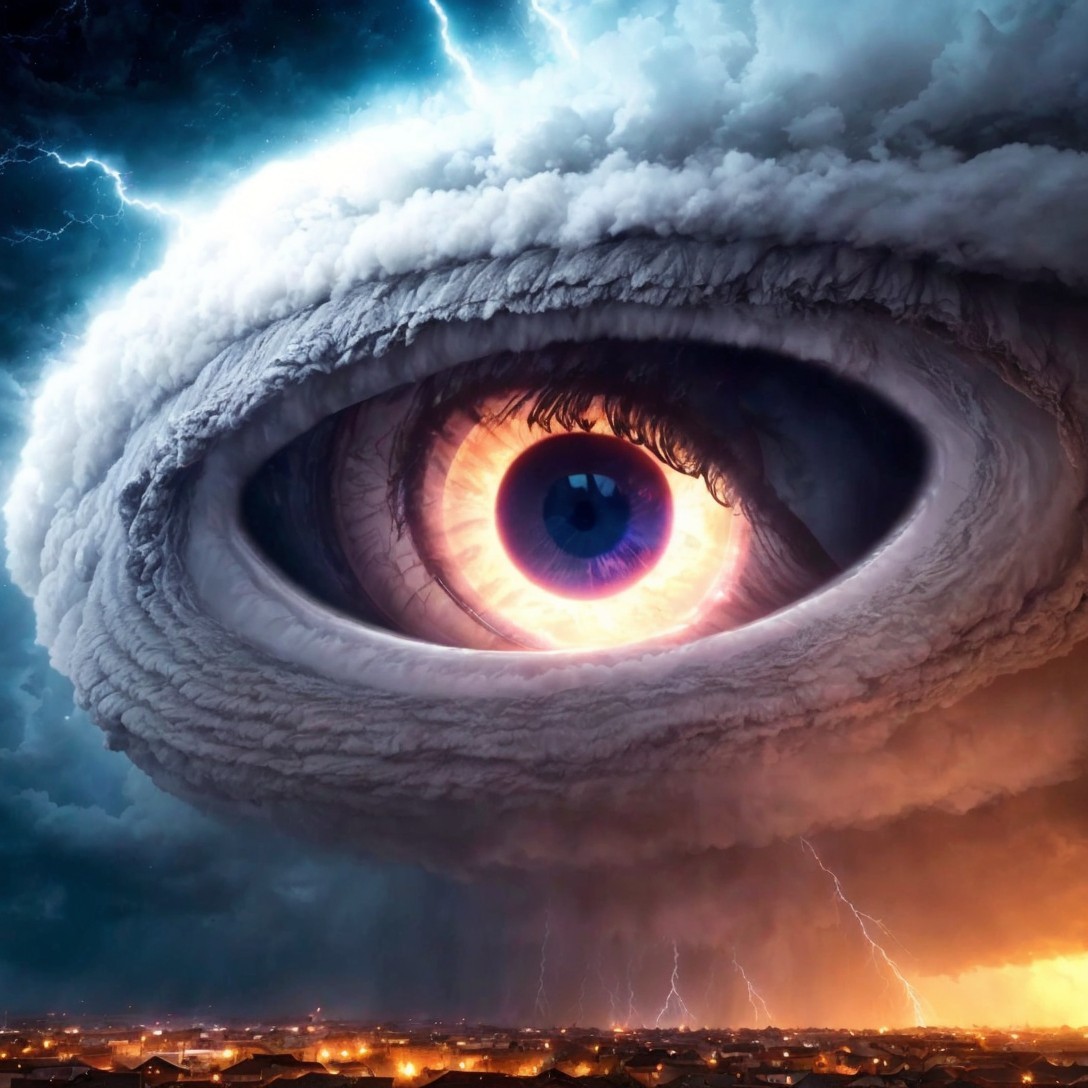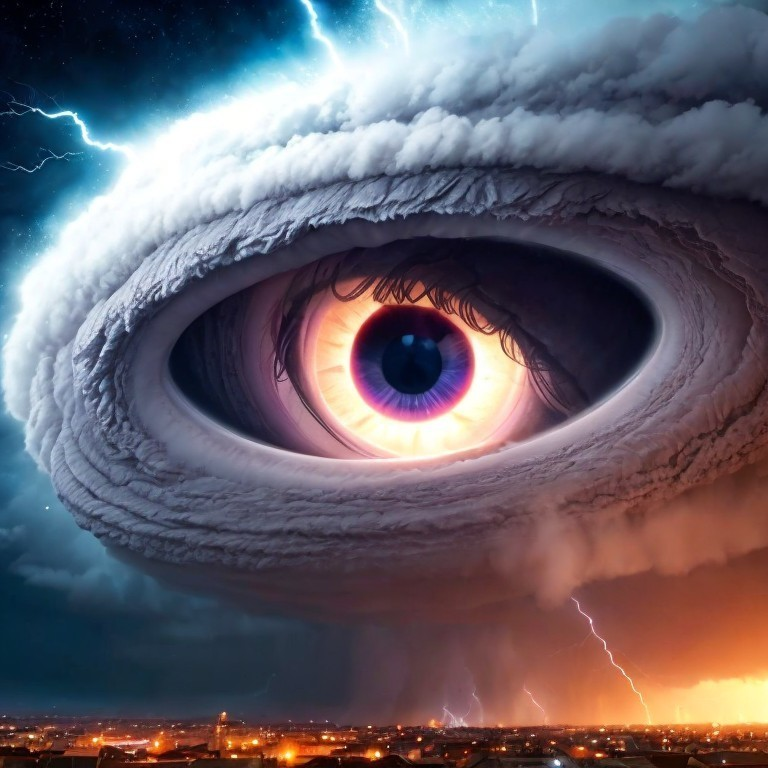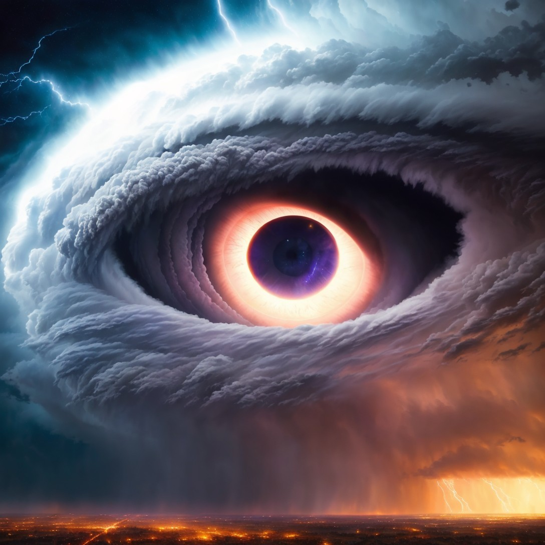 Prompt: "the scene shows a gigantic alien eye in the sky, the eye brings a terrible weather storm of intense lightening and huge twisters, below is a small town about to be destroyed by the dreadful conditions, lots of tiny people looking up and running for their lives from the terror that is coming towards them,"