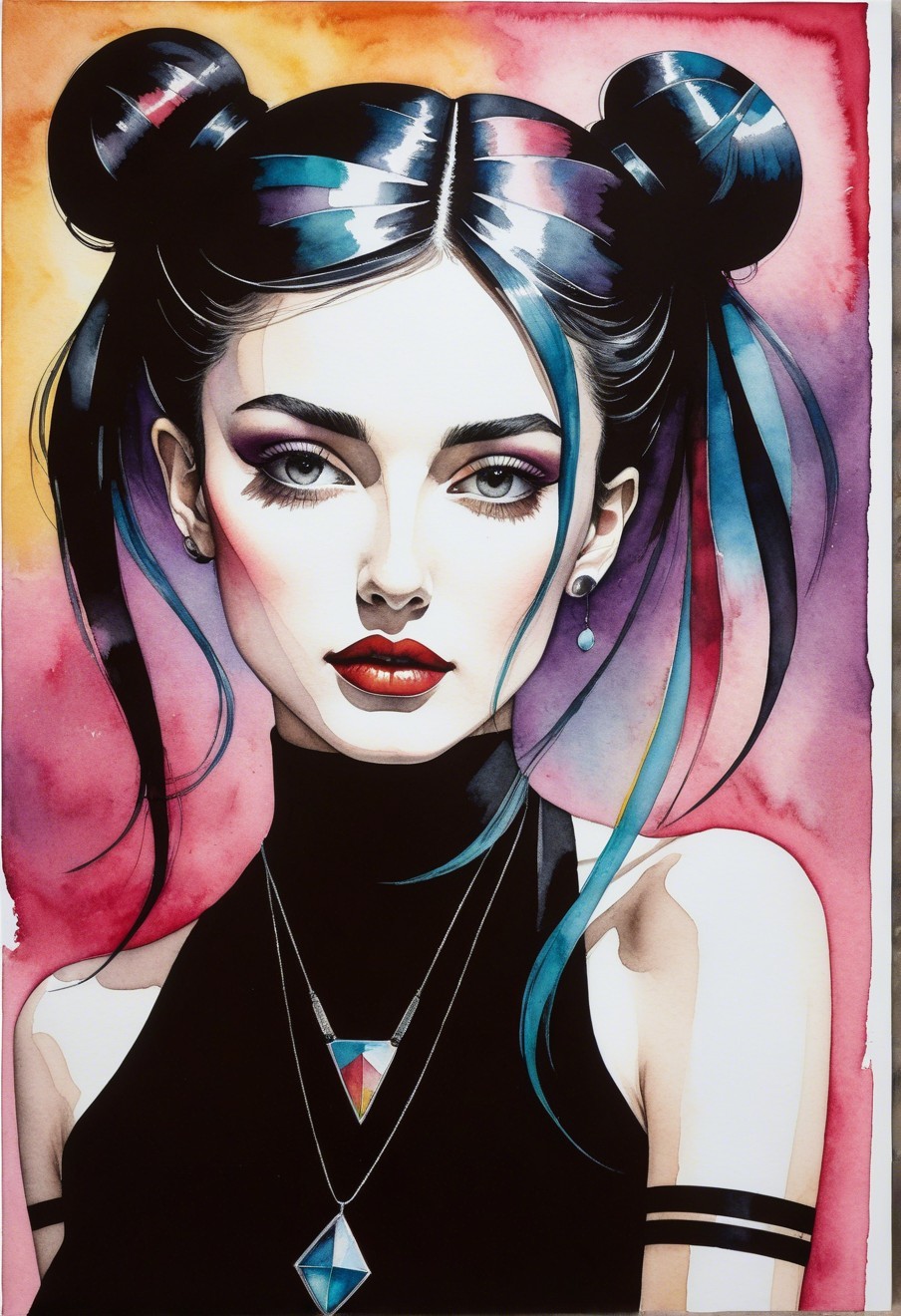 Prompt: Intricate portrait featuring wavery coloring, watercolor and ink, alternative, polychromatic stylization, glossy finish, evening mood, wavery and watery details, dry ink brush outlines, reminiscent of Georgia O'Keeffe's style with a figurative retropunk influence inspired by Zio Ziegler and Lyonel Feininger, dynamic composition with an asymmetrical layout, featuring a spectacular glitter effect that illuminates the scene. Capture a sense of movement and action reminiscent of the styles of Man Ray and Ho Baron, infusing the artwork with a glossy skin texture and a metallic shine. Incorporate a color palette inspired by Georges Pichard, utilizing rich hues to enhance the visual impact. Integrate a delicate filigree texture of fine lines to add depth and intricacy, complemented by a watery overspray of paint for a unique visual effect, contoured tetradic color scheme burnt-orange light-orange currant-red goldenrut-yellow with delicate paper fibers and subtle paint cracks, mesmerizing splash ink technique. Embrace a unique coloring style reminiscent of Georges Seurat, blending aquatint with aquarelle extrusion for a captivating watercolor effect, illuminated by dappled lighting. Explore tesselated, stippled, and blotted textures for a touch of realism, with a nod to 1970's vintage cartoon aesthetics, American Gothic merged with comic book art. Maximalism, rule of thirds. Plasticity 1.3, ambient occlusion 1.3, parallax occlusion 1.3, raytraced shadows 1.3, dynamic lighting 1.3, lighting by Ed Paschke, dark fantasy meets surrealism, paper-cut technique, sculpted, flowing hair illusion, ethereal atmosphere, layers of fabric evoke a sense of calmness and harmony, plasticity 1.6, dynamic lighting effects, ambient occlusion, hues by Ho baron harmoniously stylized, complex setting fusing storybook illustration with a blotting method, bleeding ink, drawing on textured paper, red, amber, orange, indigo, warm coloring, mixed media, precisely executed fine line-art, grunge aesthetic, metallic-honey accents, wavery dappled lighting, zentangle, rim lighting, foampunk. Ensure smooth, brightness, joyful 3 point lighting, consistent lines for a coherent and nuanced composition, immerse in an intricate world, crafted ambiance, mosaic with hatching influences, color hues by Overton Loyd, luminism approach, watercolor overspray,fusion art concept, precise Gelsculpt 64K, stylized chipped forest background, simplistic, intricate indiecore details,