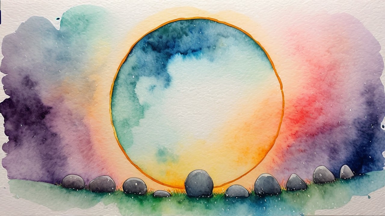 A vibrant watercolor painting featuring a large, soft-edged sun set against a gradient sky. Surrounding colors blend from warm oranges and yellows to cool blues and purples, creating a serene atmosphere.