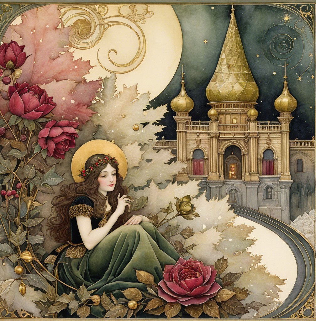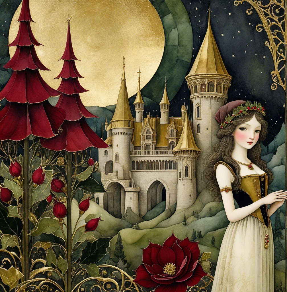 Legend of the Christmas girl and the magical Christmas rose palace,, 3rd century French miniature art. Velvet Black, Shabby, Dull Gold, olive green, burgundy, Golden Ratio, Surreal Fantasy, Elegant, High Definition Ultra Fine 3D Line, Zenangle Style, Watercolor Patchwork , Arthur Rackham Style, Paul Kidby, Gediminas Prankevicius, Jacek Jerka, Extremely Detailed, Intricate, Thoughtful, HDR, Fractal, Beautiful, Award Winning, Fantasy Look, Fantasy, Crisp Quality