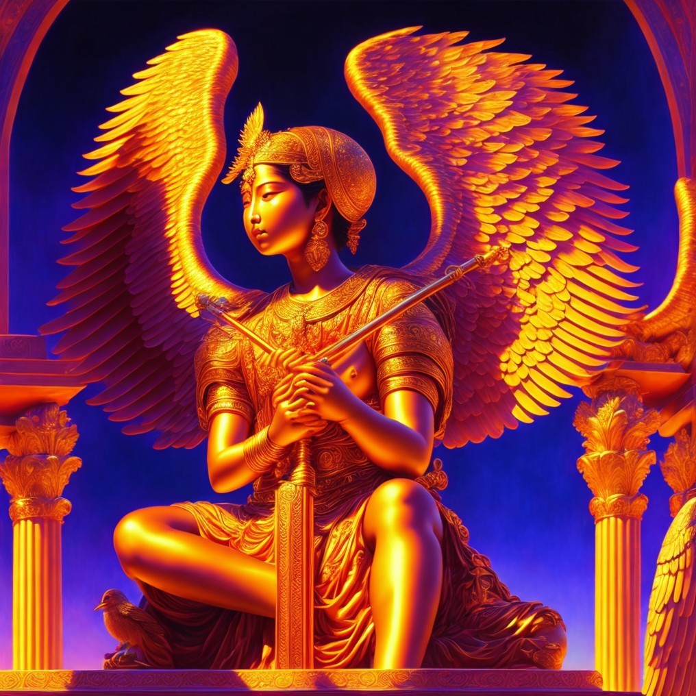 A golden statue of a winged humanoid figure, possibly depicting a deity, with intricate details, seated against a blue backdrop.