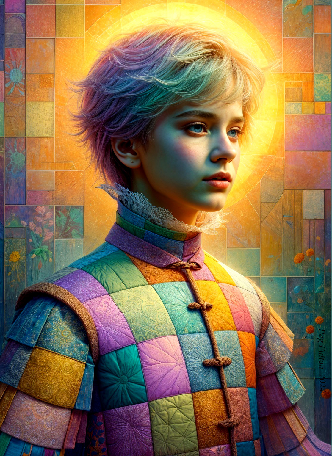 A young person with short, pastel-colored hair stands against a vibrant, patterned background. They wear a multi-colored, quilted outfit that reflects a whimsical, artistic style, illuminated by a warm glow.