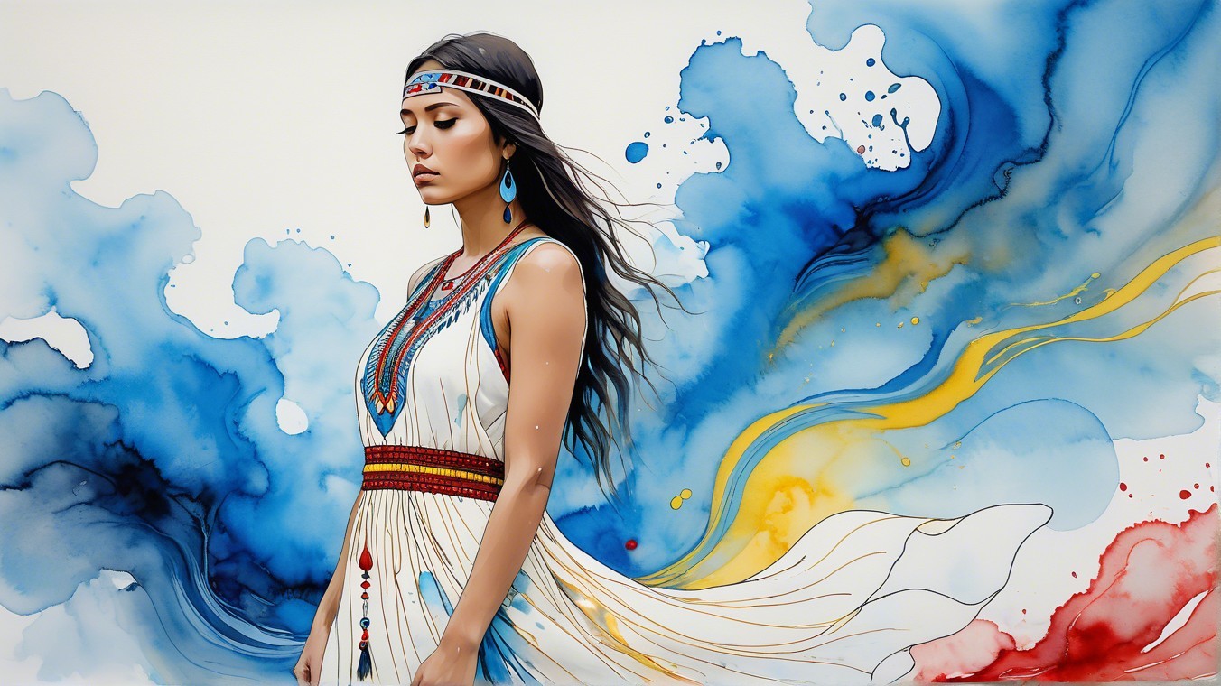 A young woman in a flowing white dress with vibrant colors swirling around her, embodying grace and elegance. She wears a headband and earrings, blending cultural beauty with artistic expression.