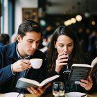 A couple sits intimately at a café table, sharing a moment over coffee and wine. The warm ambiance of a busy street, illuminated by lamps, adds a romantic touch to the scene.