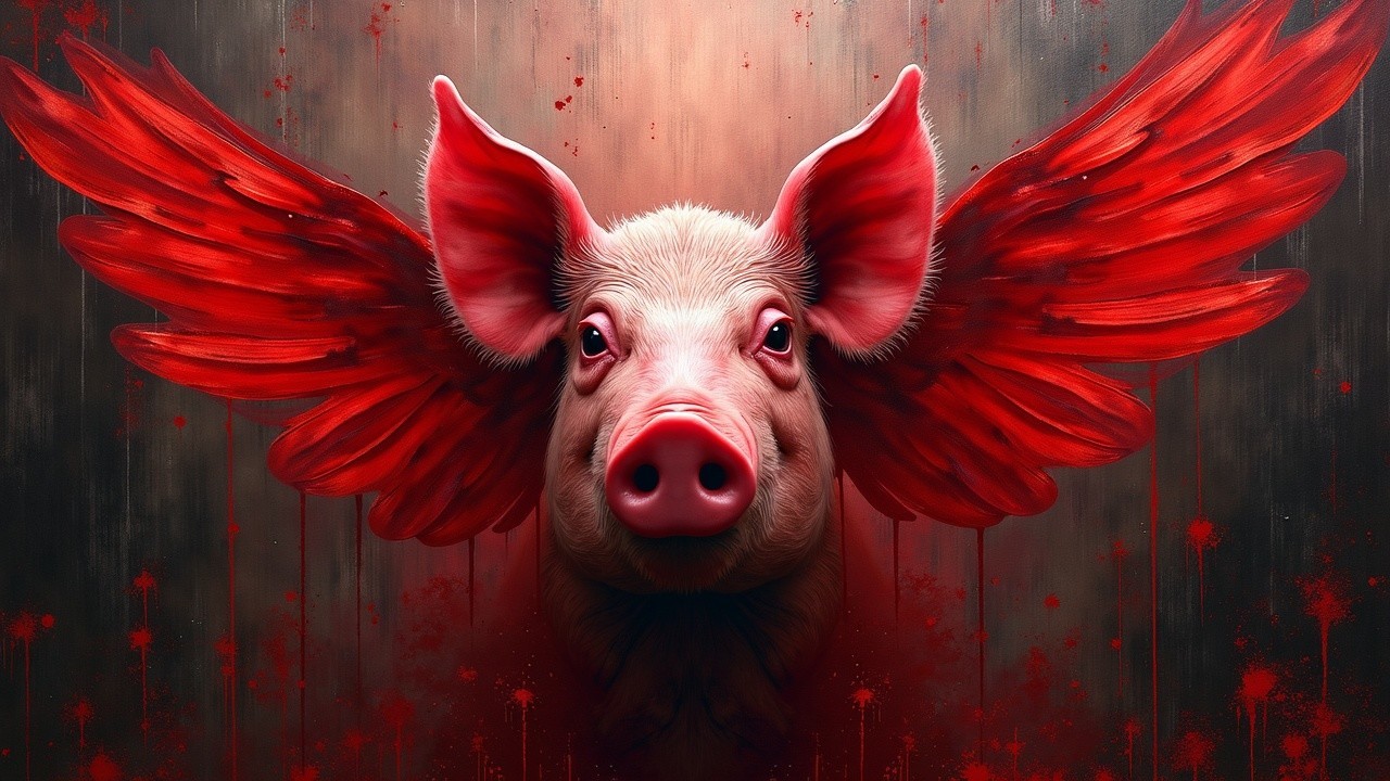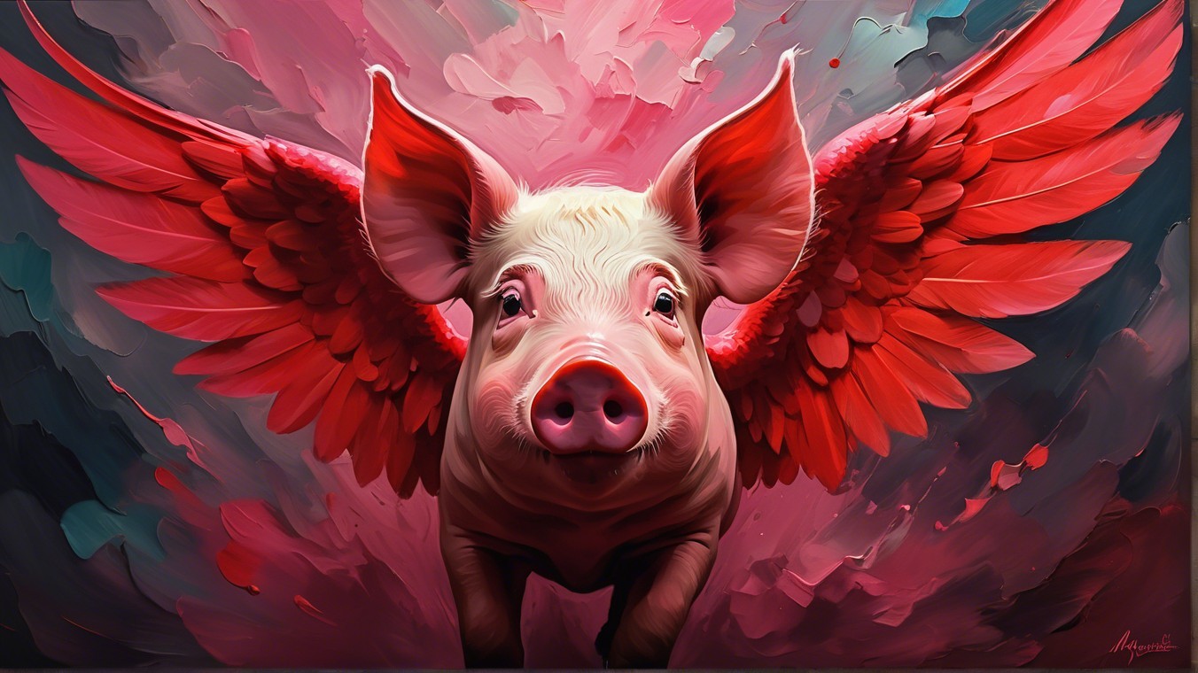 A whimsical image of a pig with vibrant red wings soaring against a dramatic, colorful sky. The pig has a joyful expression, embodying a playful mix of fantasy and charm.
