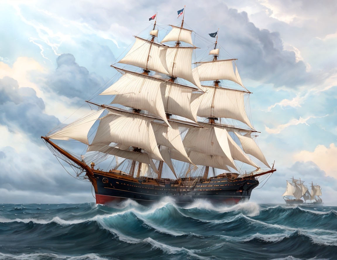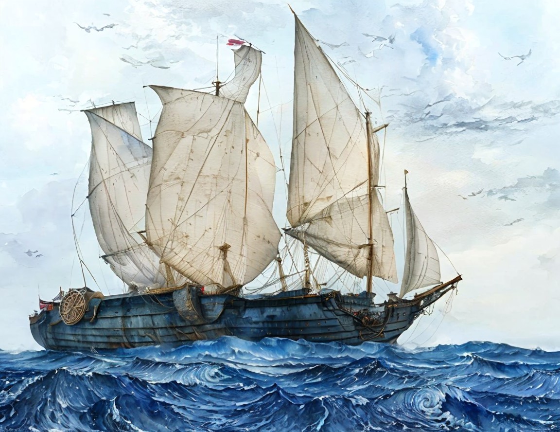 Prompt: 3D. Large ancient sailing ship battling stormy ocean waves, a flock of seagulls circles the ship, dramatic cloud backdrop, watercolor painting, dynamic brushstrokes, bright colors that are textured, detailed ship with billowing sails, turbulent waters with foamy crests, ominous clouds in the sky, hints of lightning in the distance, cascading waves crashing against the ship, billowing crests of waves rolling in far in the background