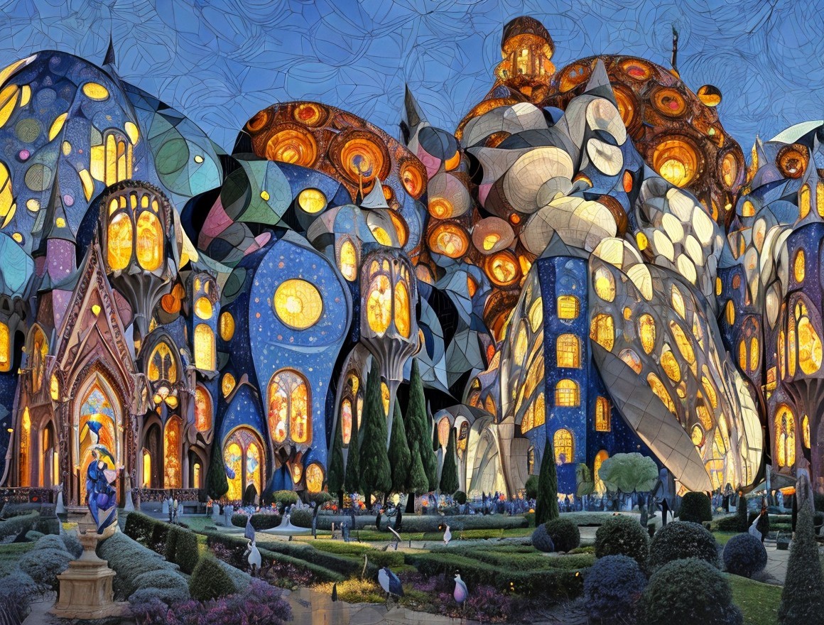 + Prompt:Futuristic concert halls, museums and statues behind a bare hedge, trees bushes, curved, crooked and straight, round turrets with pointed roofs, many illuminated windows, birds, men, blue time, acrylic painting, inspired by Javier Mariscal